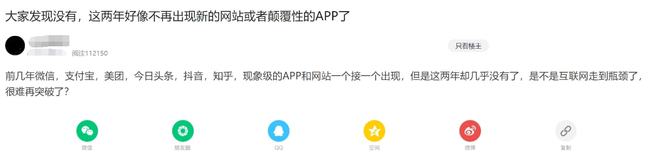“前几年微信、支付宝、美团、今日头条、抖音、知乎等APP的网站一个接一个出现,但是最近这两年几乎没有了,是不是互联网走到瓶颈期,很难再有新突破了?”