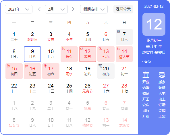 放假时间:2021年2月10日(周三)——2021年2月17日(周三),共八天。